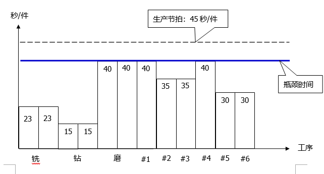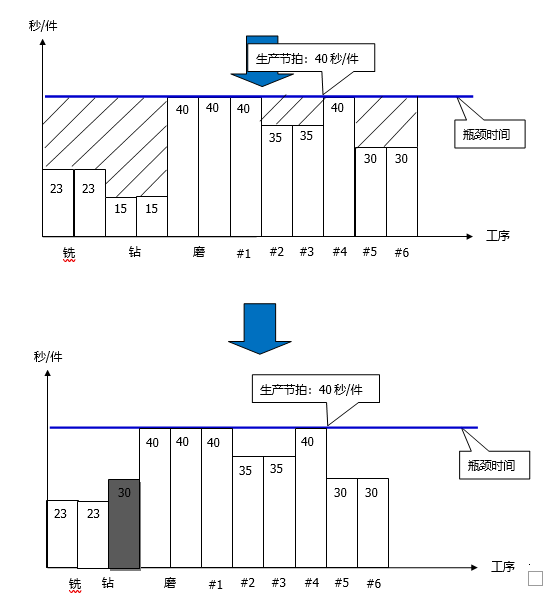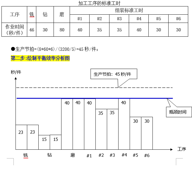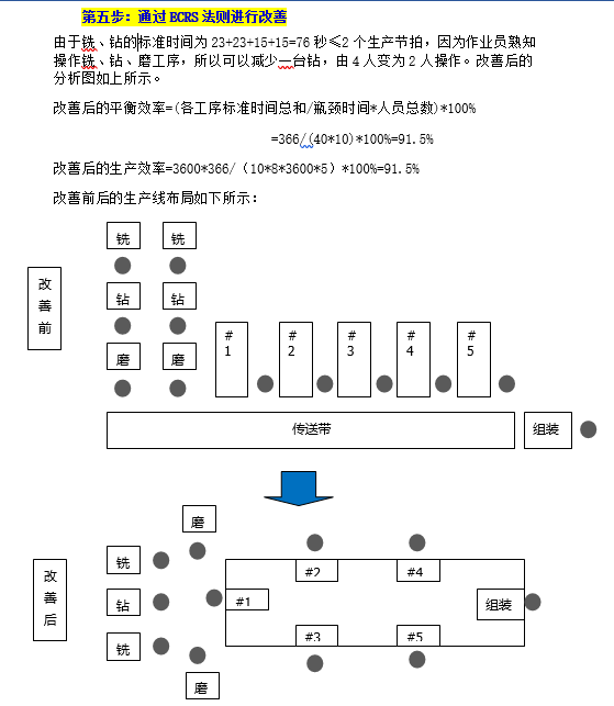 該廠某系列產品的加工工藝流程為銑→鉆→磨→組裝。該車間實行5天8小時工作制,每周的產量為3200件。該加工廠生產線平衡改善如下:
